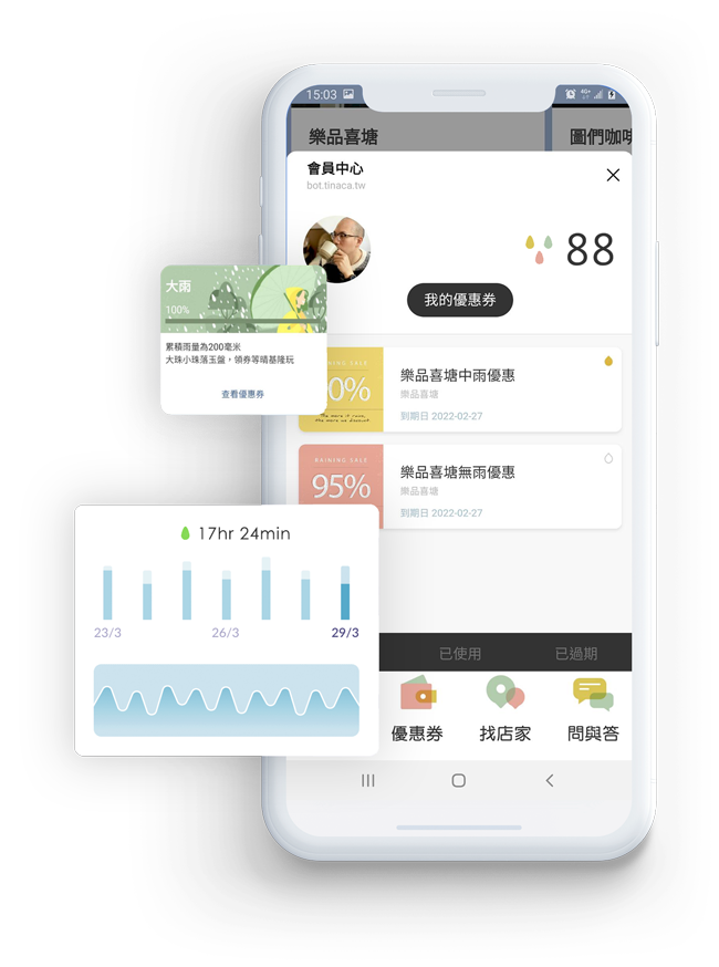 亭仔咖透過使用率超過90%的LINE平台,打造第一個以「累積雨量」做為優惠與消費者互動的創意系統。